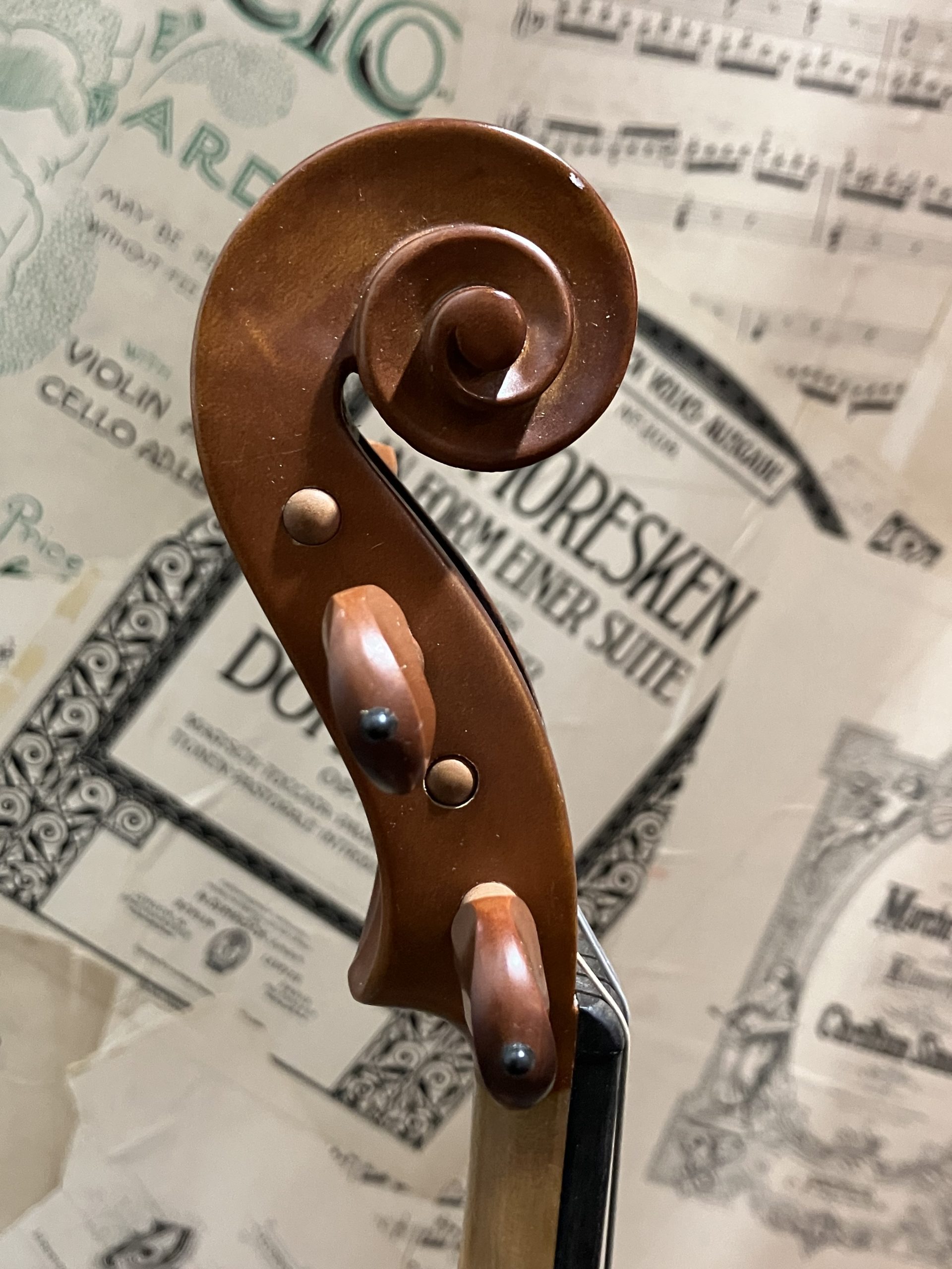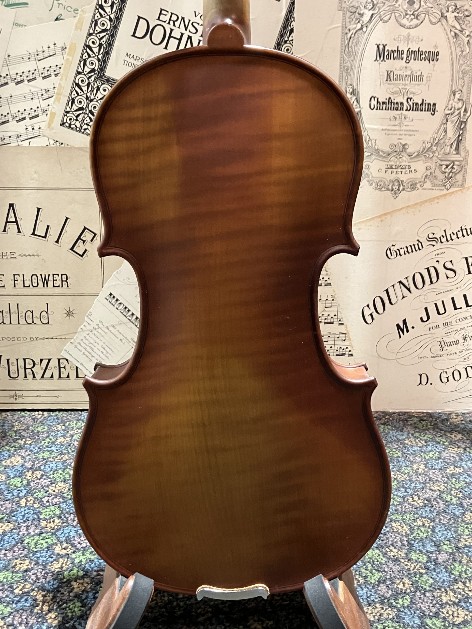 Popular brand secondhand instrument with to suit a keen beginner or improving player on a budget. Very good condition. Boxwood pegs and chin rest and ebony fingerboard. Boxwood tailpiece fitted with 4 fine tuners. Attractive, strongly flamed Chinese maple back and sides with gold/orange coloured satin varnish in very good condition. Not a big sound but very pleasant.