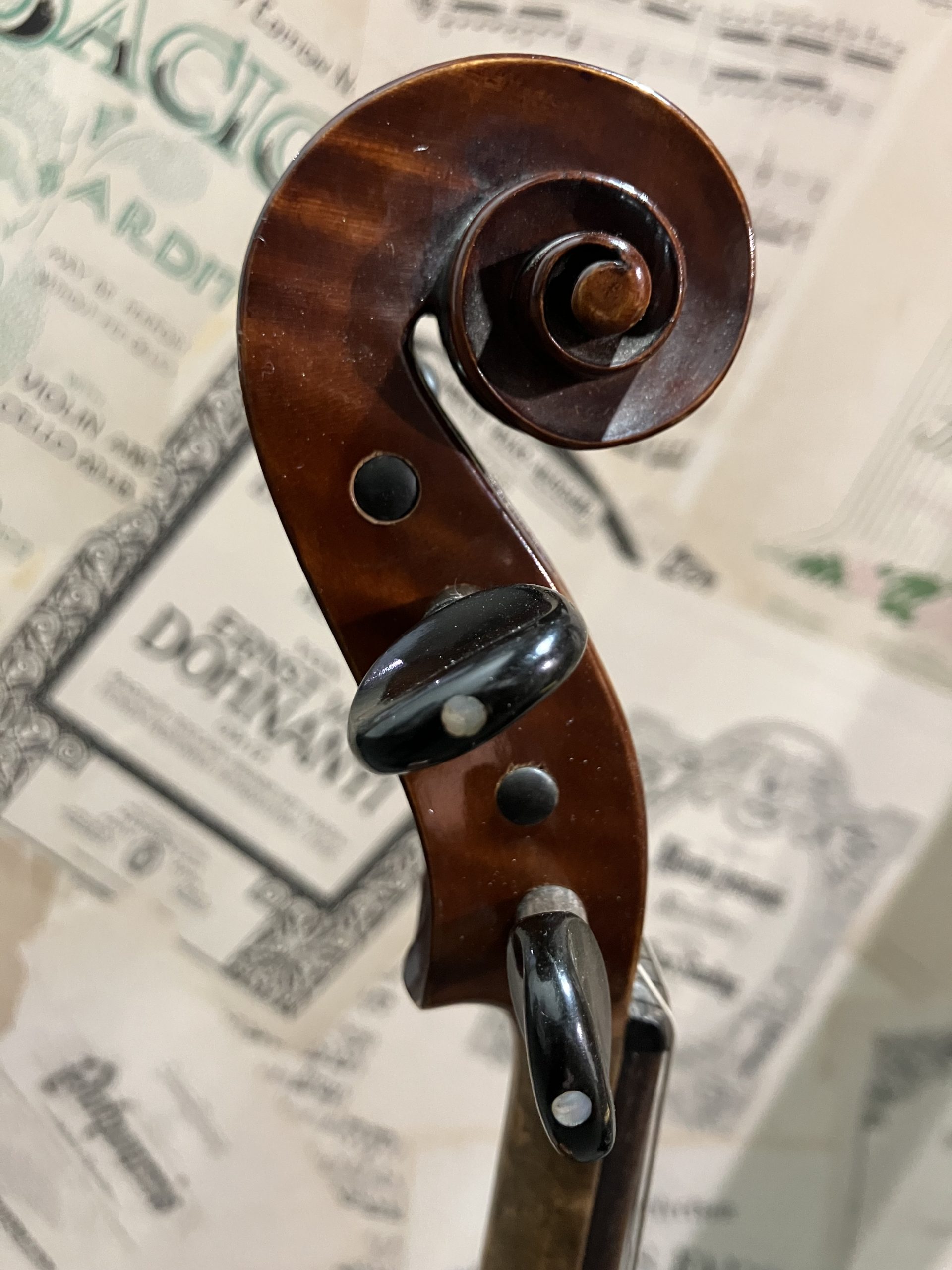 A 4/4 size French good quality Trade violin.  Excellent structural condition and nice dark brown varnish cover.  Fitted with new Wittner tailpiece with four built in fine tuners and new Pirastro Evah Pirazzi strings.  Good resonant, crisp, clear sound to suit an advancing player looking for a more interesting tonal response from their instrument.