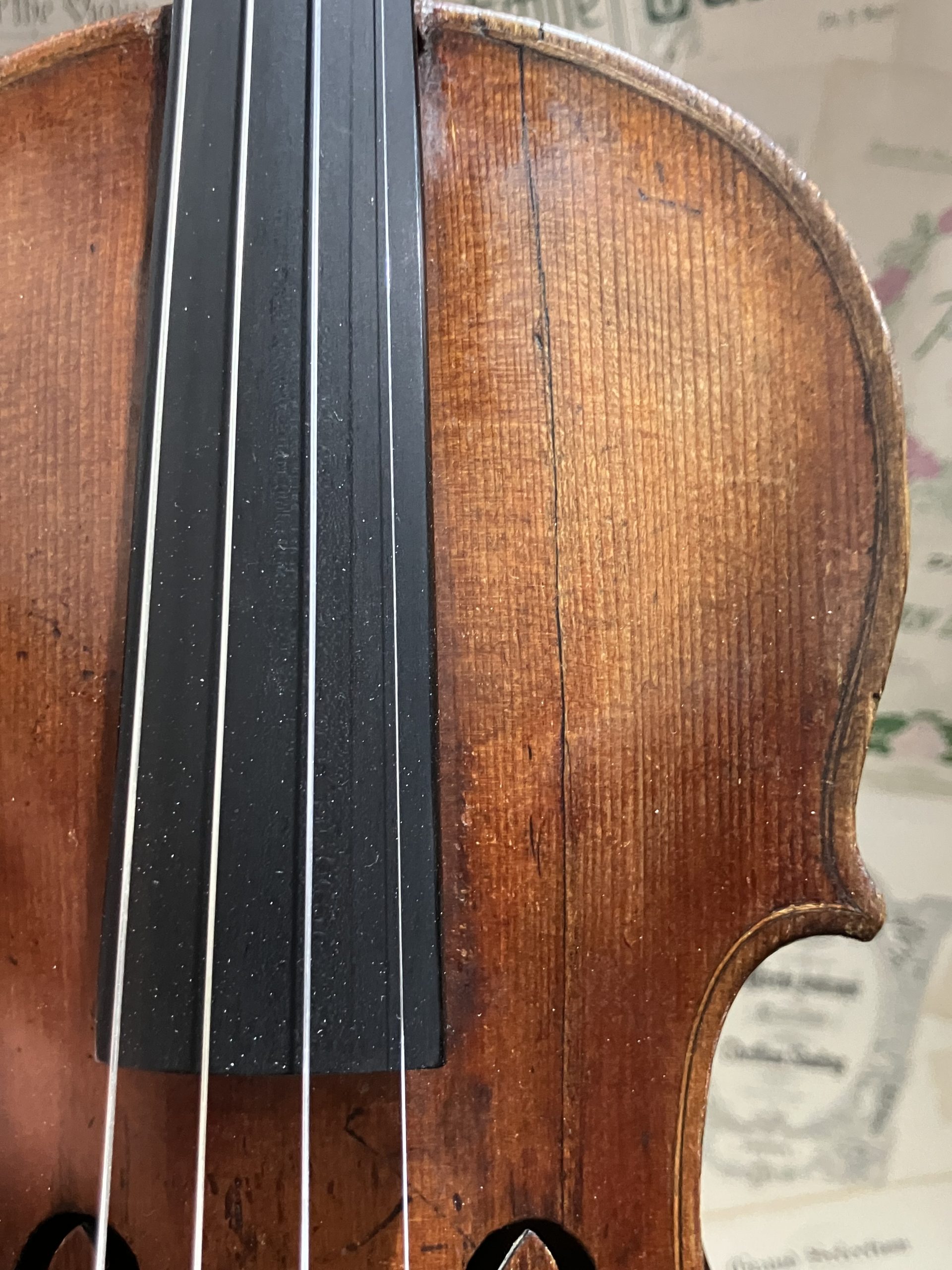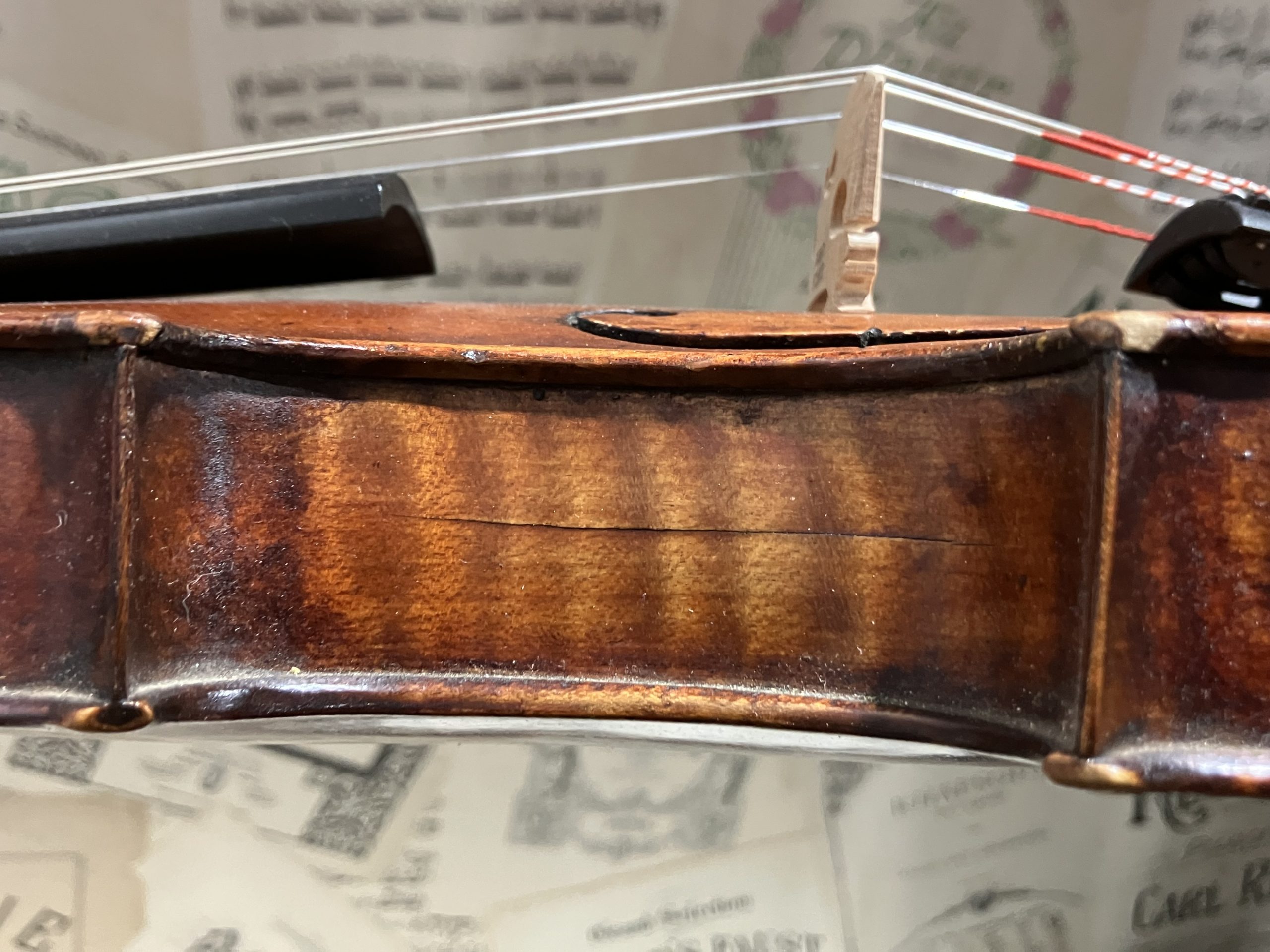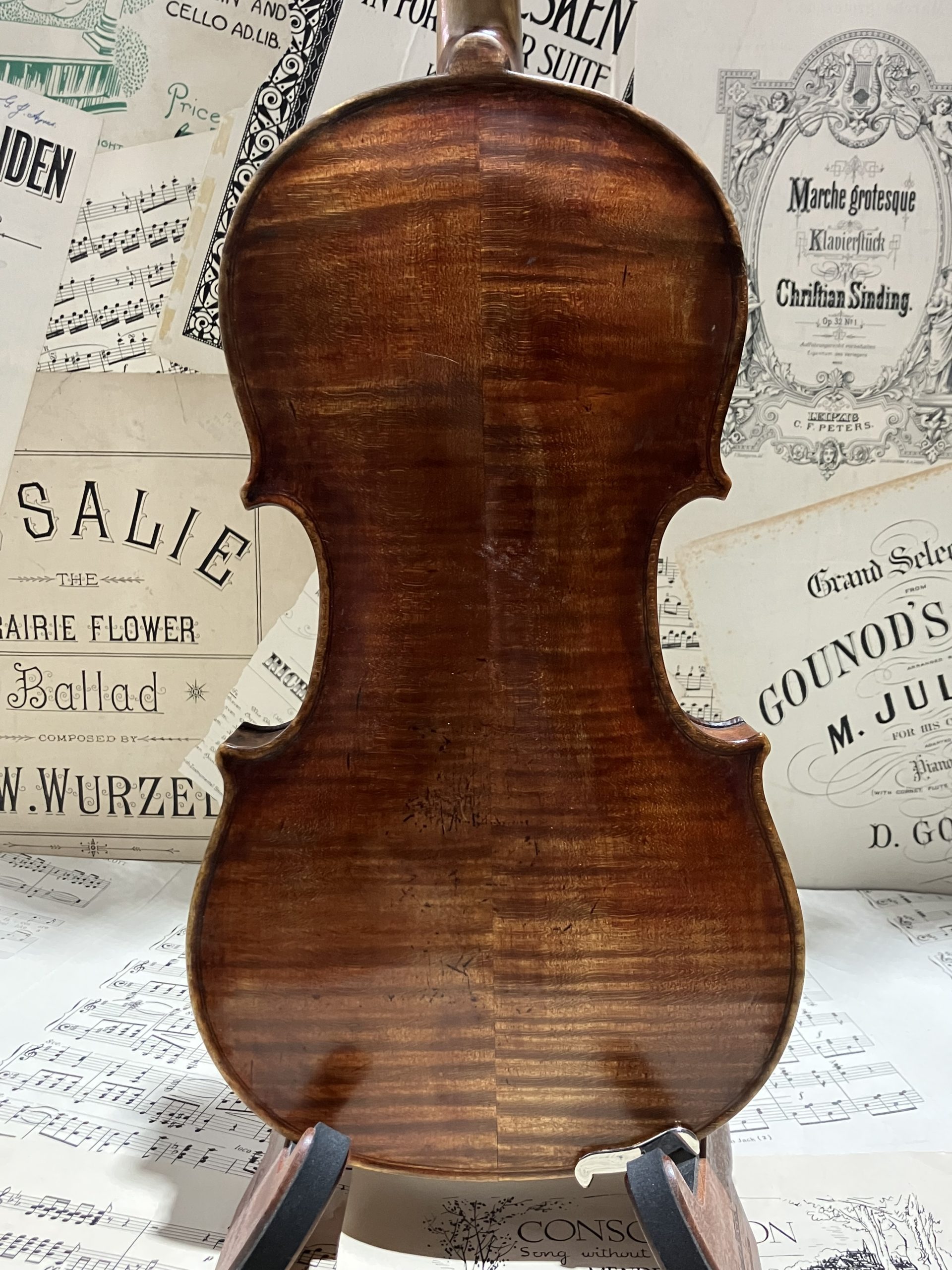 An attractive old violin in very good condition, most likely from a German maker or workshop well over 100 years ago.  Good structural condition (a couple of repaired {internally cleated} belly cracks and a rib crack in the centre bout: not unusual for this age) with a light brown/gold varnish with subtle orange/red highlights.   Very nice, strongly flamed back (matching ribs) with good, fairly full arching. Very warm and clear, even and resonant sound, not too loud; a much sought after “old violin” timbre which is very enjoyable to play.