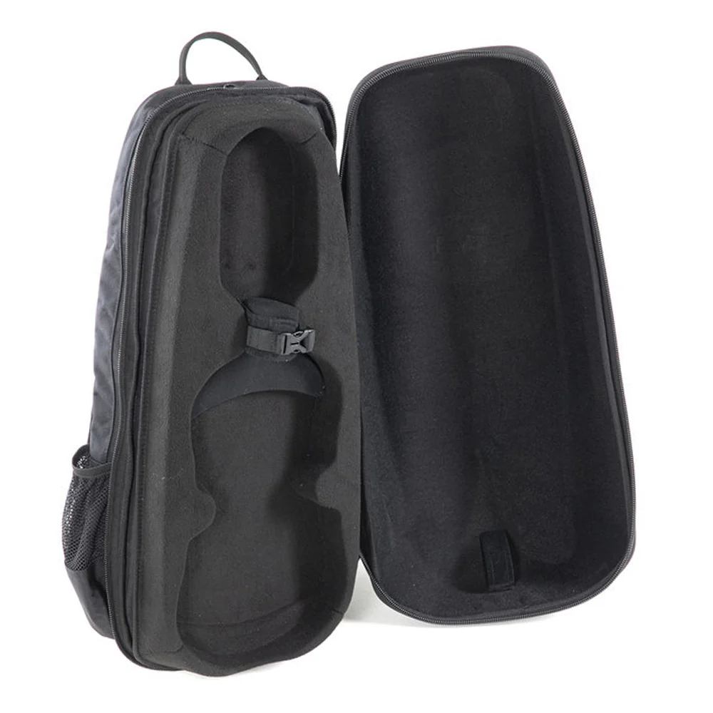 The ergonomic back, along with the padded backpack straps, ensures comfortable and relaxed travel – whether on foot, on a bike, motorbike, bus or train. The robust outer lid is made of polycarbonate. Internally, the padded suspension system and instrument bed are made of high-density polyurethane foam. Combined, they ensure your instrument is safe and secure.