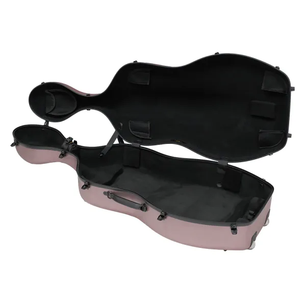 Lightweight HQ Polycarbonate Cello Case in Brushed Rose Gold. Features a ~4.6kg bodyweight, 2 webbed bow holders, adjustable neck restraint, padded backpack straps, reinforced endpin plate and in-built wheels.