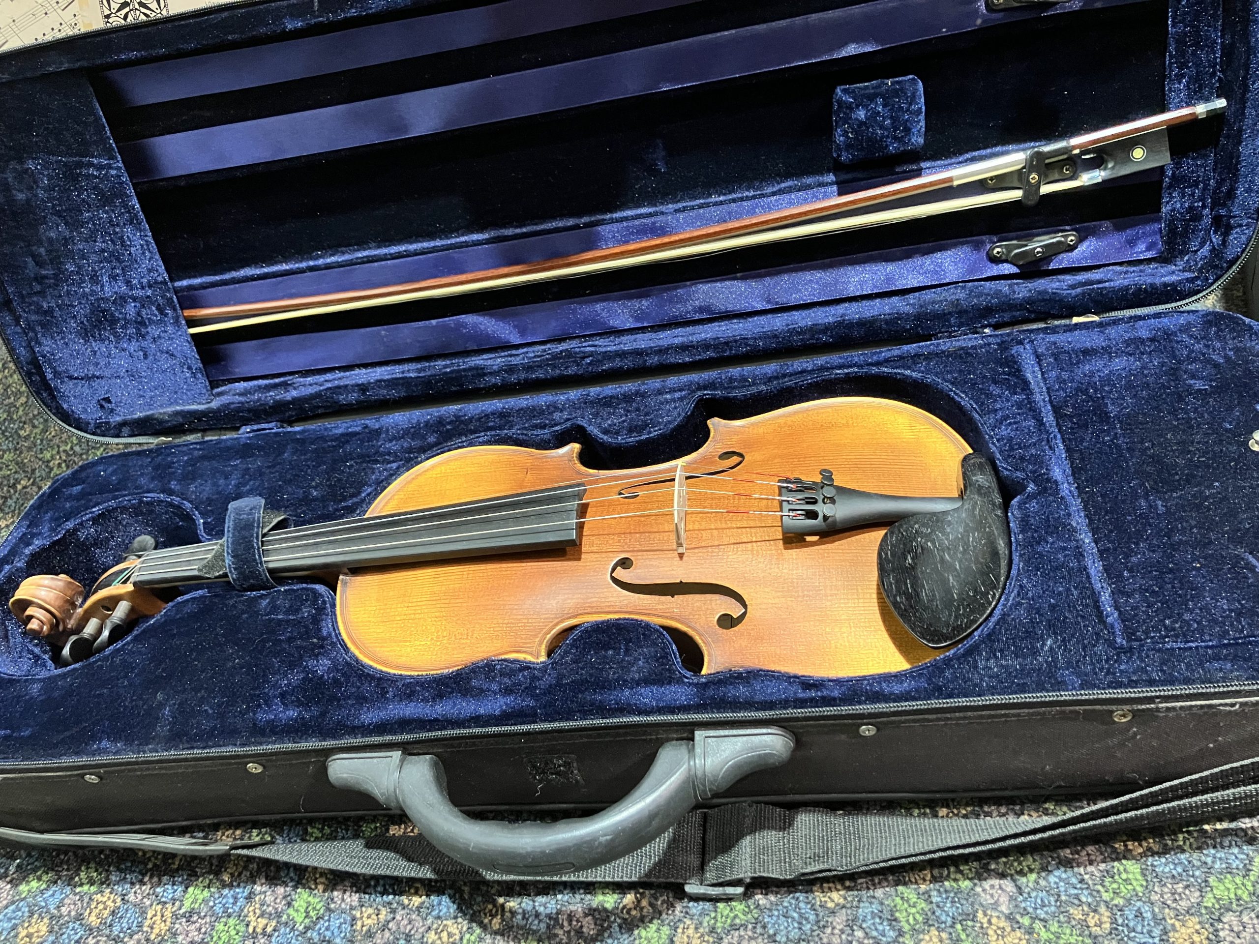 Excellent condition 4/4 size German designed, Chinese made violin outfit. Suitable for keen beginner or advancing student looking for a first “step-up” instrument. All ebony fittings, plus tailpiece with 4 built in fine tuners. Fitted with new Pirastro Tonica strings. Good strong sound.