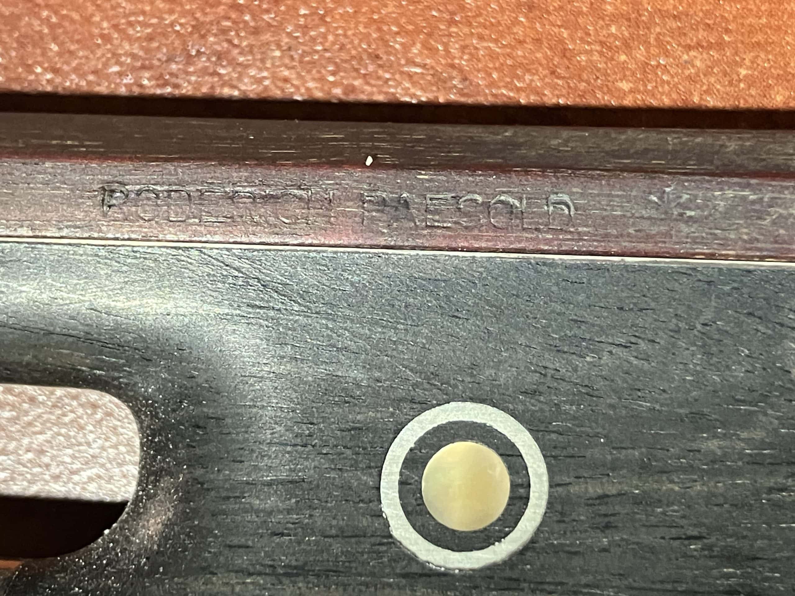 Very nice, strong and straight pernambuco wood viola bow branded Roderich Paesold * (one star). Bow is sterling silver mounted and plays very nicely.